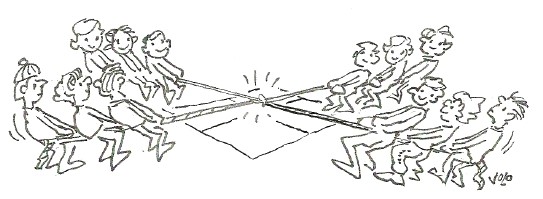 Klassen deles opp i fire like sterke grupper. På lærerens kommando trekker alle i tauene. Målet er å trekke elevene fra de andre grupper inn i sin egen firkant. Så snart en elev er trukket over i en annen gruppes felt stoppes leken. De trekkende grupper får et plusspoeng og den tapende gruppe får et minuspoeng.